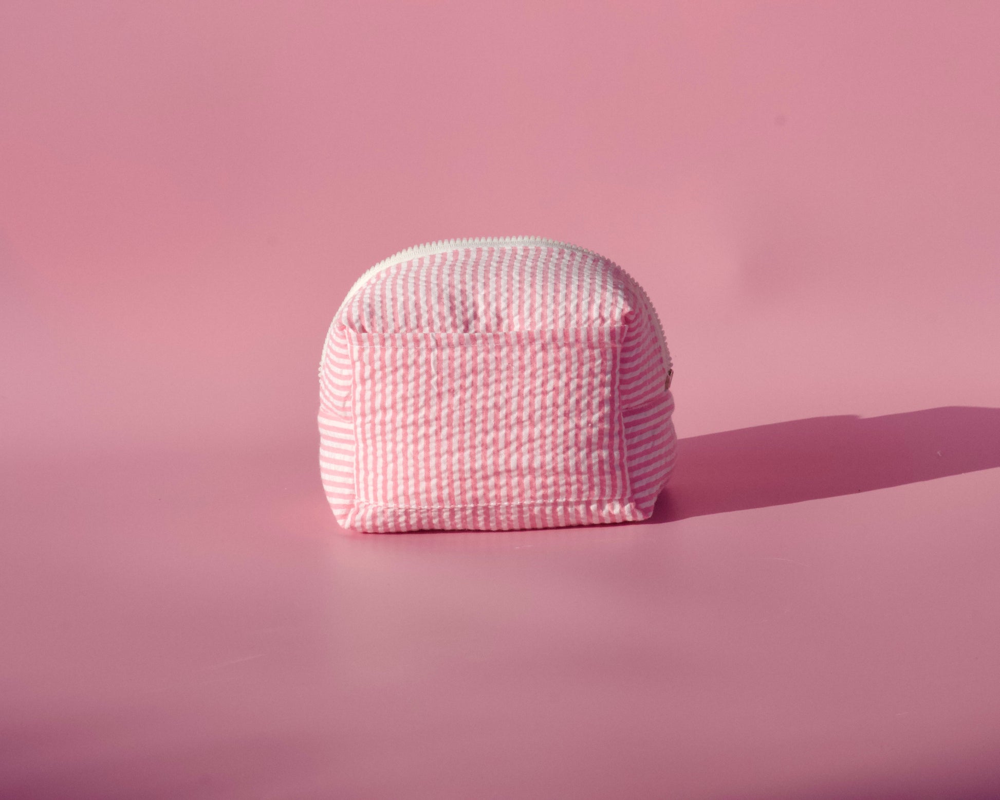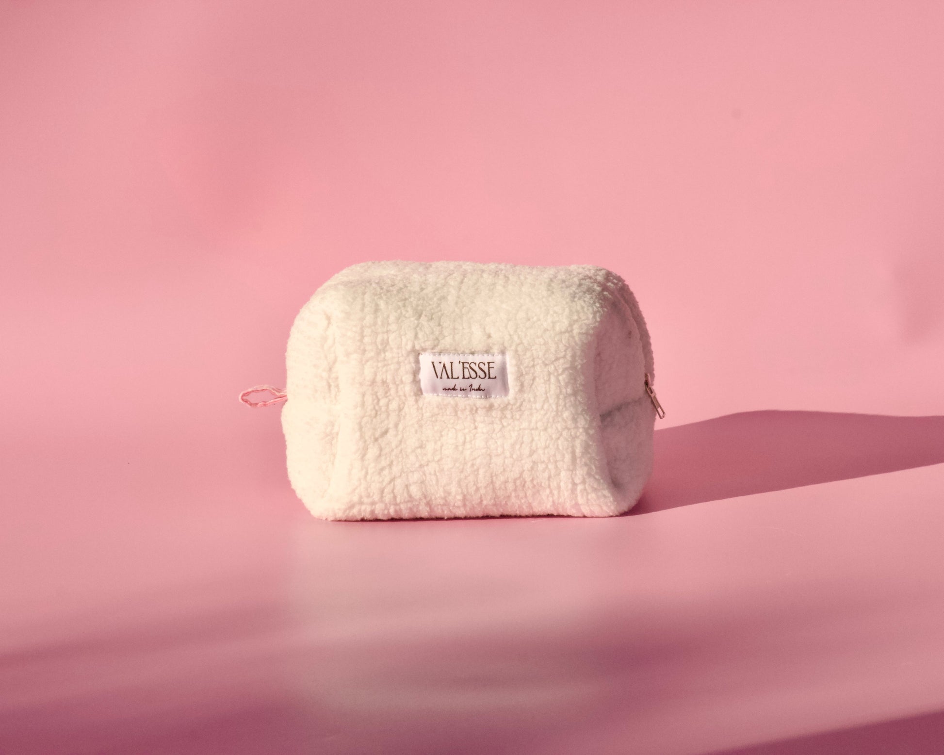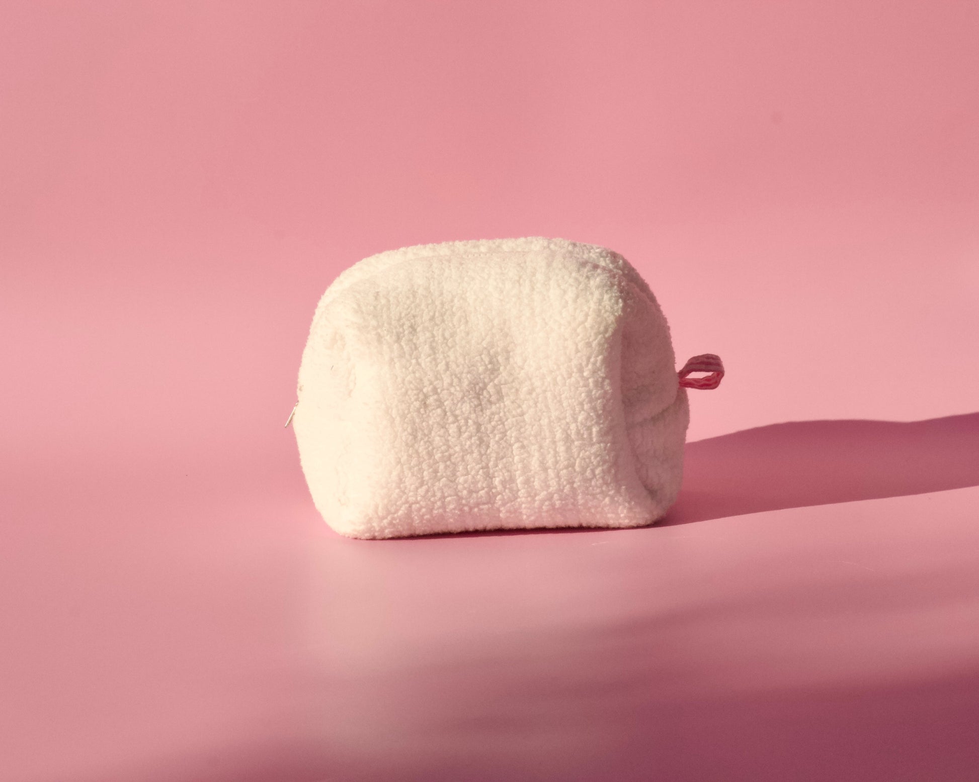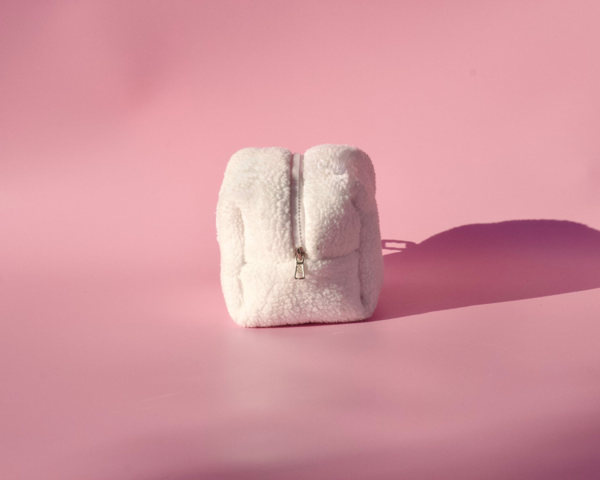 It feels like holding a little cloud. Soft, comforting, and familiar. The interior features three pockets, one large on one side and two smaller on the other; making it easy to organize your makeup, skincare, and hair essentials. The clean white teddy fabric exterior paired with playful pink striped lining creates a cozy and practical companion.